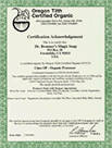 (オーガニック認定書は、アメリカ認定機関Oregon Tilth Inc.発行。)